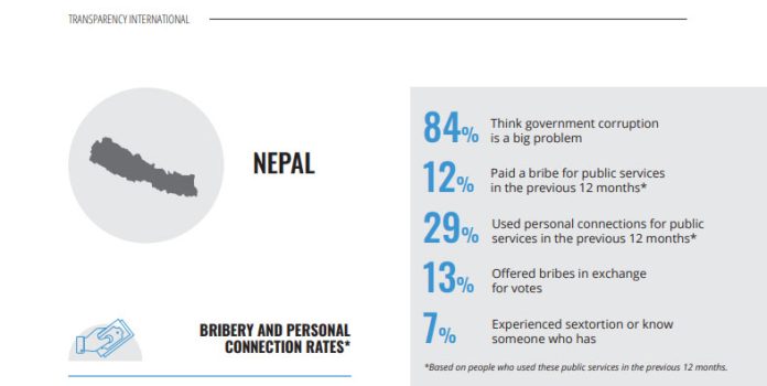 नेपालका ८४ प्रतिशत जनताले भ्रष्टाचार ठूलो समस्या रहेको सोच्ने गरेको पनि प्रतिवेदनले उल्लेख गरेको छ । त्यस्तै, १२ प्रतिशत जनताले एक वर्षमा सार्वजनिक सेवा लिँदा कुनै न कुनै रूपमा घुस खुवाउनुपरेको पनि उल्लेख गरेका छन् ।