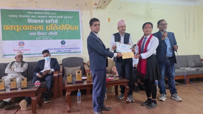 जलवायू परिर्वतनकोे असर : वातावरण जोगाउन नराखौ कुनै कसर विषय वक्तृत्वकला प्रतियोगीतामा शालिग्राम मावि सेतीबेणीका प्रतिमा तिवारी द्धितिय र बहाकी माविका निश्मा भट्टराईले तृतिय स्थान हासिल गर्न सफल भएका छन् ।